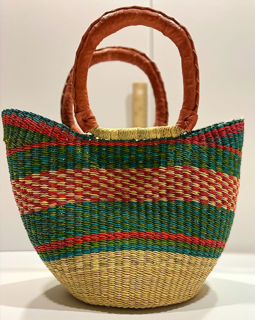 Copper.Turquoise.Natural Bolga Basket with Leather Handle from Ghana